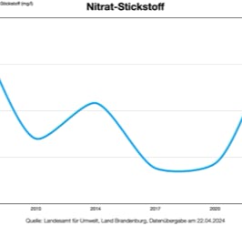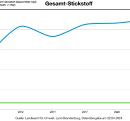 Auch andere Messwerte sind stark erhöht und weisen auf den Eintrag von natürlichen wie künstlichen Düngern hin: So steigt der Stickstoffgehalt kontinuierlich an und ist inzwischen mehr als doppelt so groß wie sein Grenzwert (Diagramm).