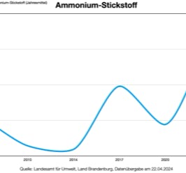 Und auch die Ammoniumwerte steigen seit 2017 weiter an und erreichten 2023 im Jahresmittel mit 0,52 mg/l nicht nur einen neuen Höchstwert. Im Frühjahr 2023 wurden mit 1,6 mg/l Ammonium-Stickstoff ein neues, erschreckendes Maximum gemessen (Diagramm).