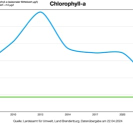 Hauptverantwortlich für die Trübung des Wassers ist verstärktes Algenwachstum: der zweite Indikator einer Überdüngung. Nachweisbar ist das Algenwachstum anhand des grünen Pflanzenfarbstoffs Chlorophyll. Während der Grenzwert für Chlorophyll nach Aussage der Fachleute im Groß Leuthener See bei unter 13 Mikrogramm pro Liter liegen sollte, zeigt der See mit bis zu 88 Mikrogramm Chlorophyll pro Liter eine bis zu sechs Mal höhere Konzentration (Diagramm)!