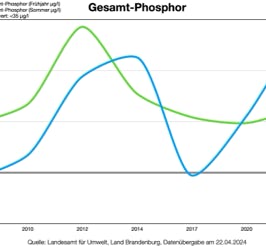 Der Phosphorgehalt des Wassers zeigt in den Spitzen eine bis zum Vierfachen überhöhte Konzentration, im Frühjahr 2023 mit einem neuen Spitzenwert von 136 µg/l (Diagramm).
